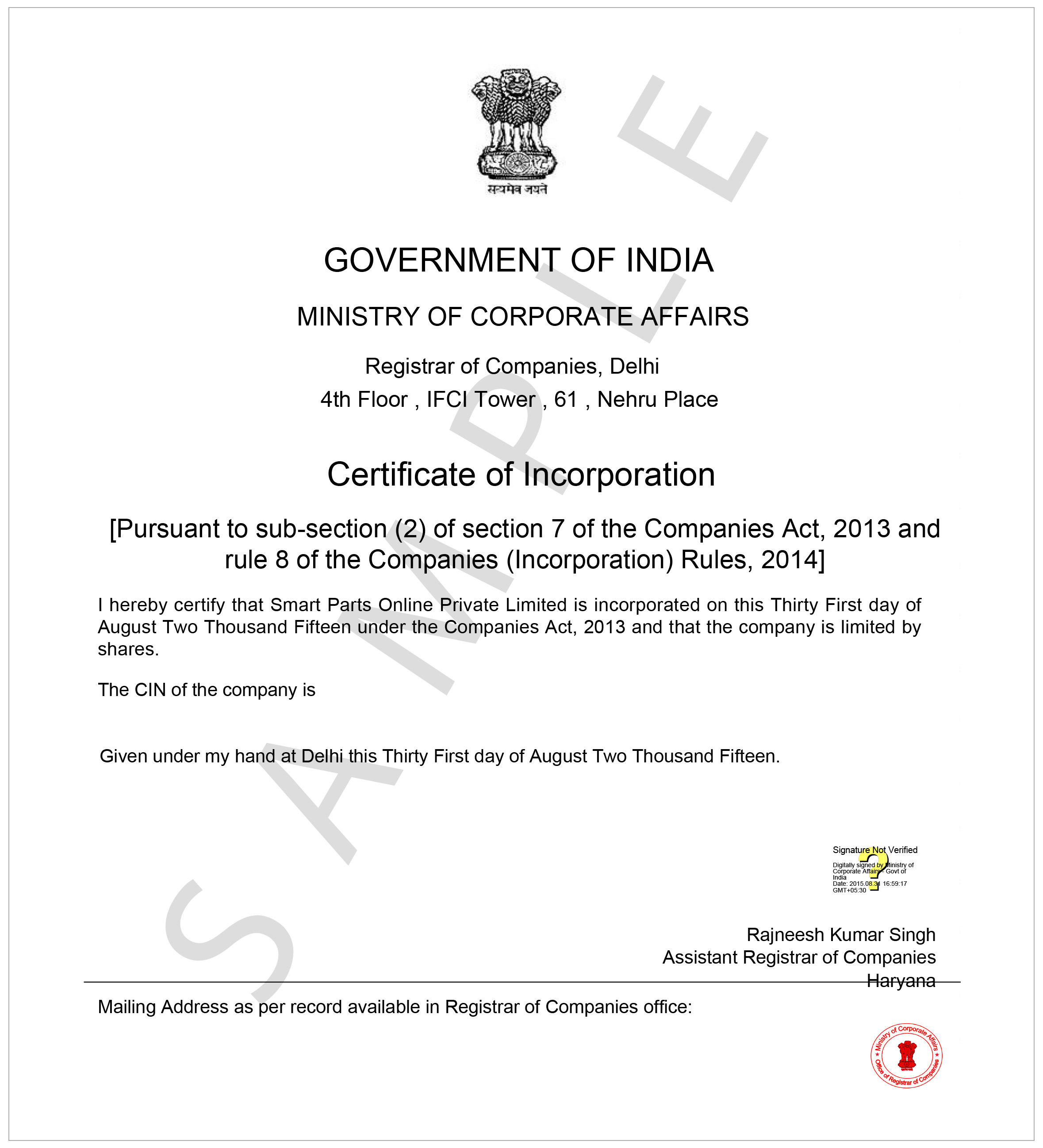 Certificate of Incorporation is a legal certificate issued by Ministry of Corporate Affairs when the company is successfully registered with the Registrar of Companies (ROC).The certificate includes the name of the corporation, company registration number, date from which the company is officially registered, the address of the corporation’s registered office, legal structure of the company (public or private company; limited or unlimited; limited by guarantee or shares), issuing Registrar, the Companies Act under which the company is registered, Official seal of the Registrar of Companies.